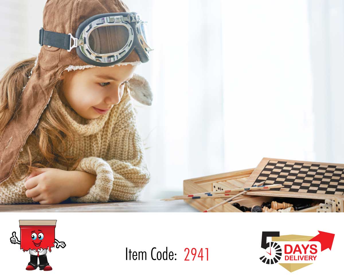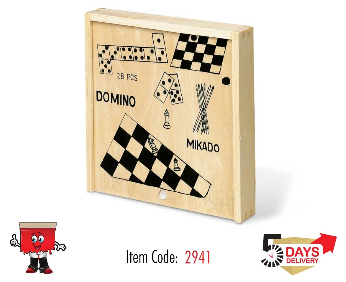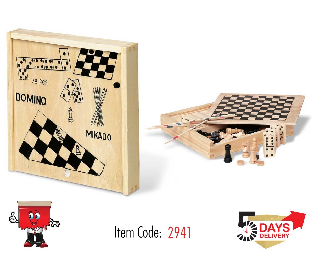 Wooden box including domino, chess, drafts and wooden sticks games.