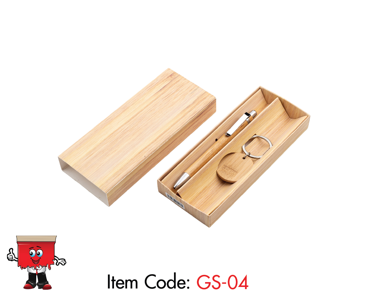 Bamboo Pen + Keychain Set Printing Options : Screen printing, UV printing, Laser engraving Packing : Gift Box Quantity: 100pcs Carton Size: 39 X 38 X 27 cm Carton weight: 5.9kg