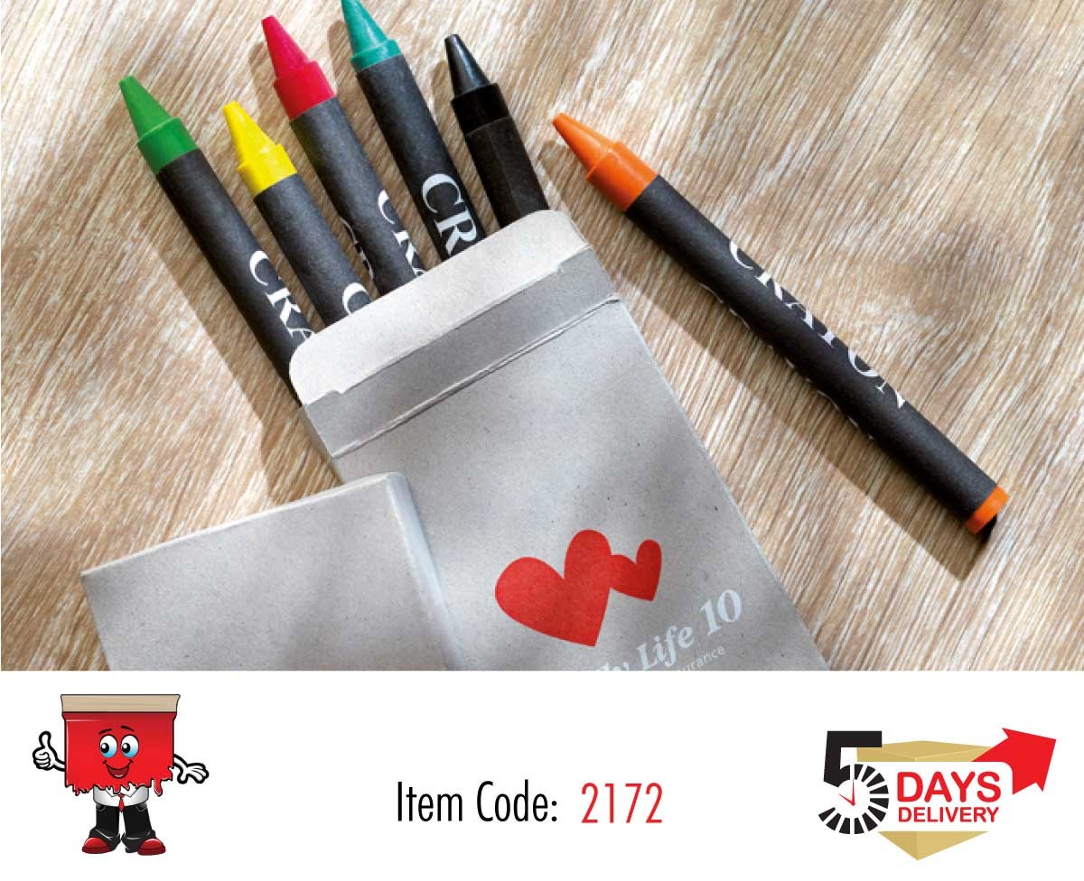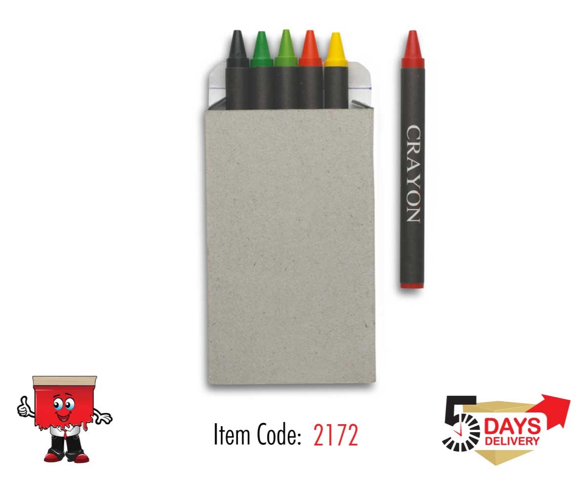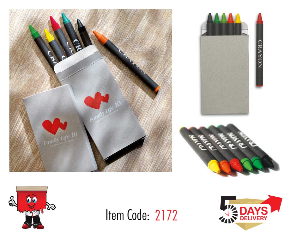 Set of 6 wax crayons in natural carton box. Non-toxic.