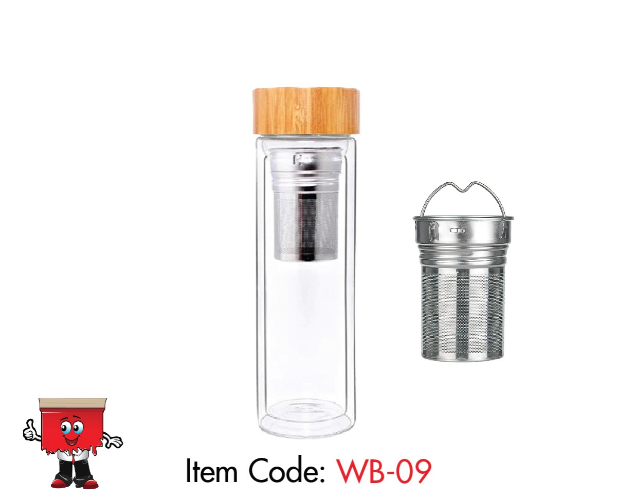 Double wall in borosilicate glass bottle and bamboo lid with tea infuser.