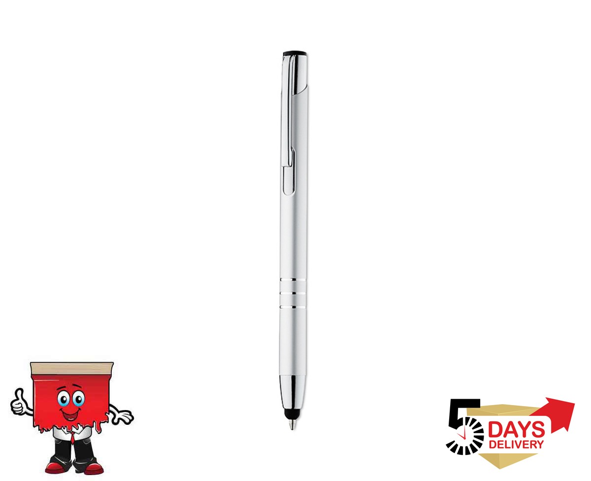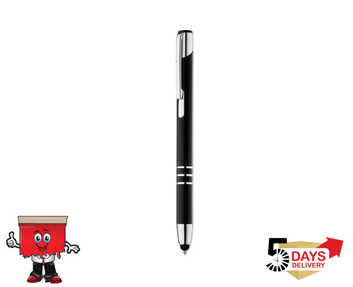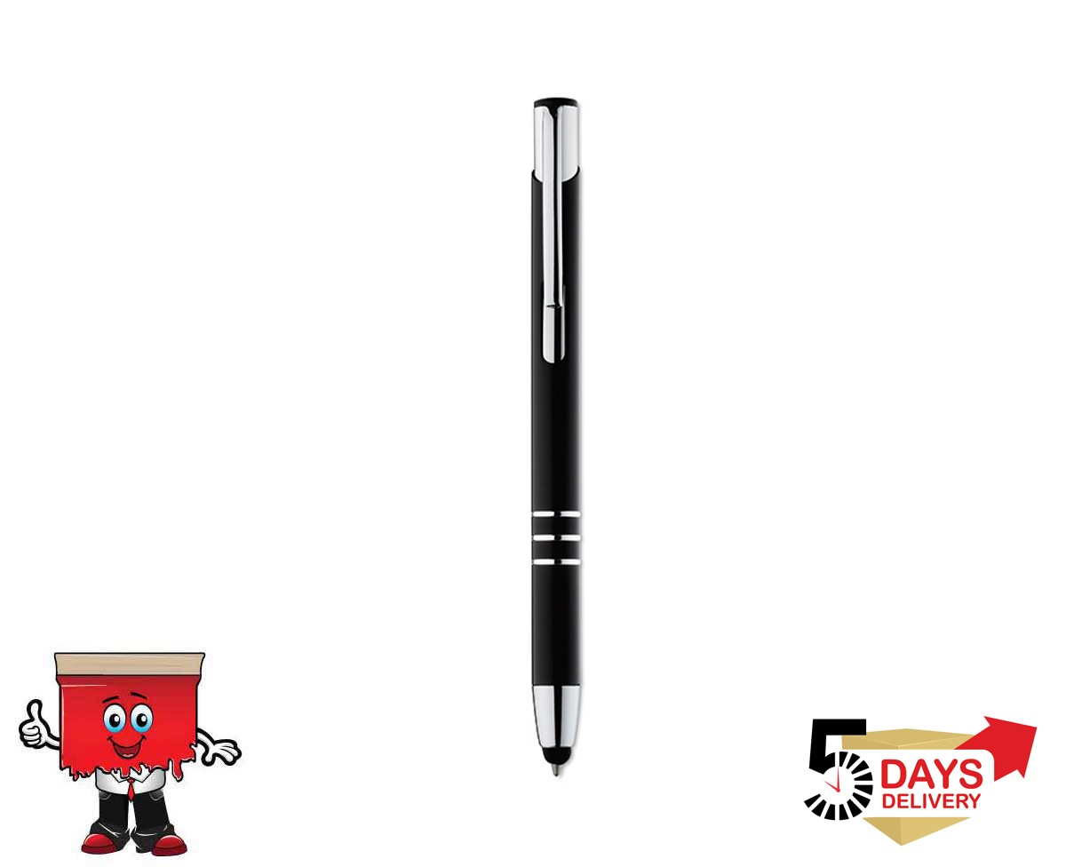 Aluminium push ball pen with 3 shiny rings on bottom and soft touch tip.