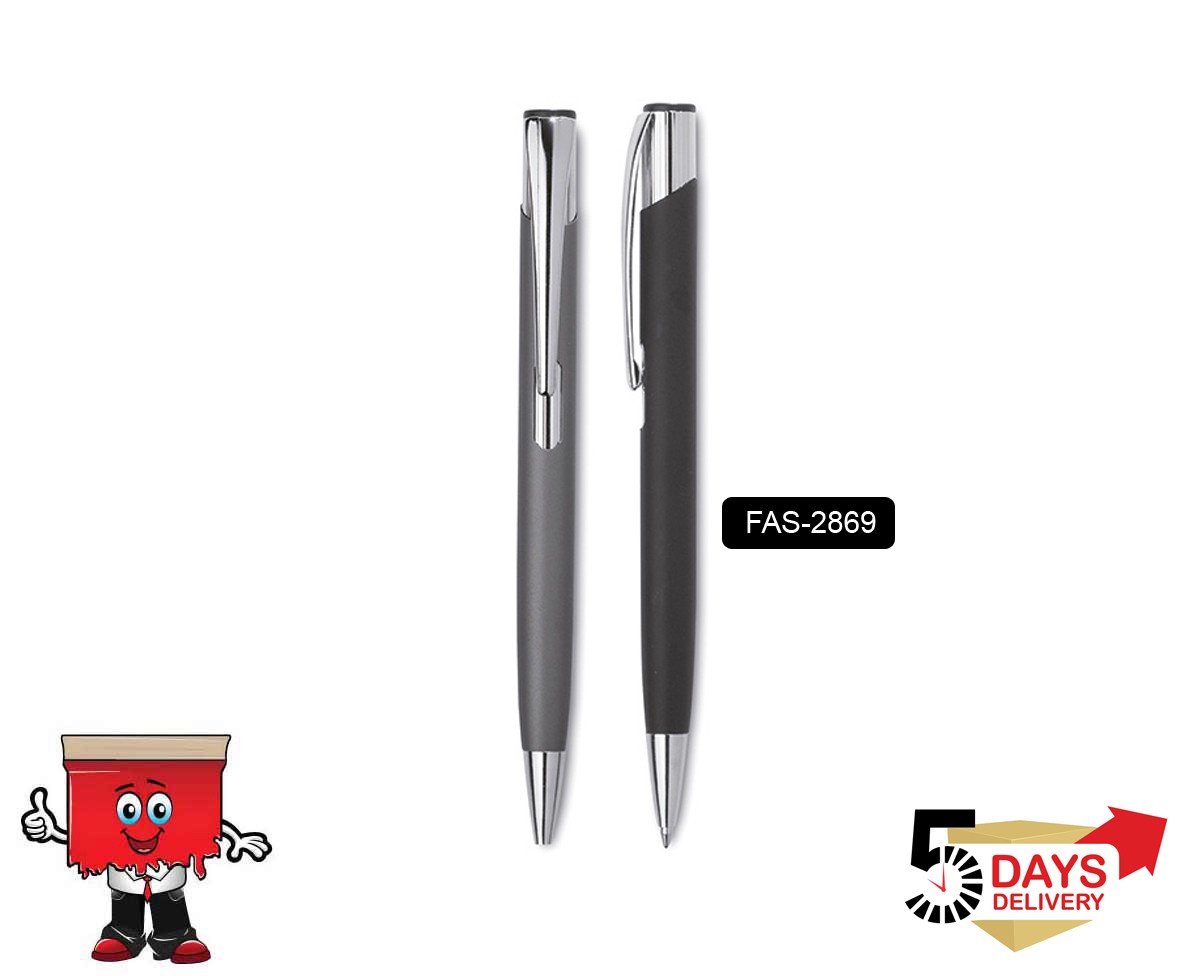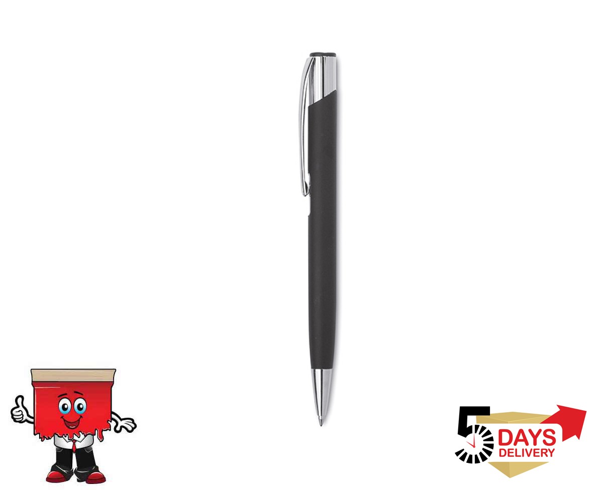 Push type aluminium ball pen with shiny chrome details.