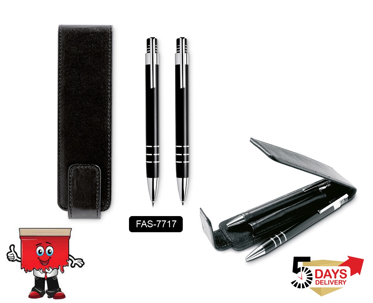 Push type blue ink ball pen and mechanical pencil set in anodized aluminium barrel with matt satin finish.