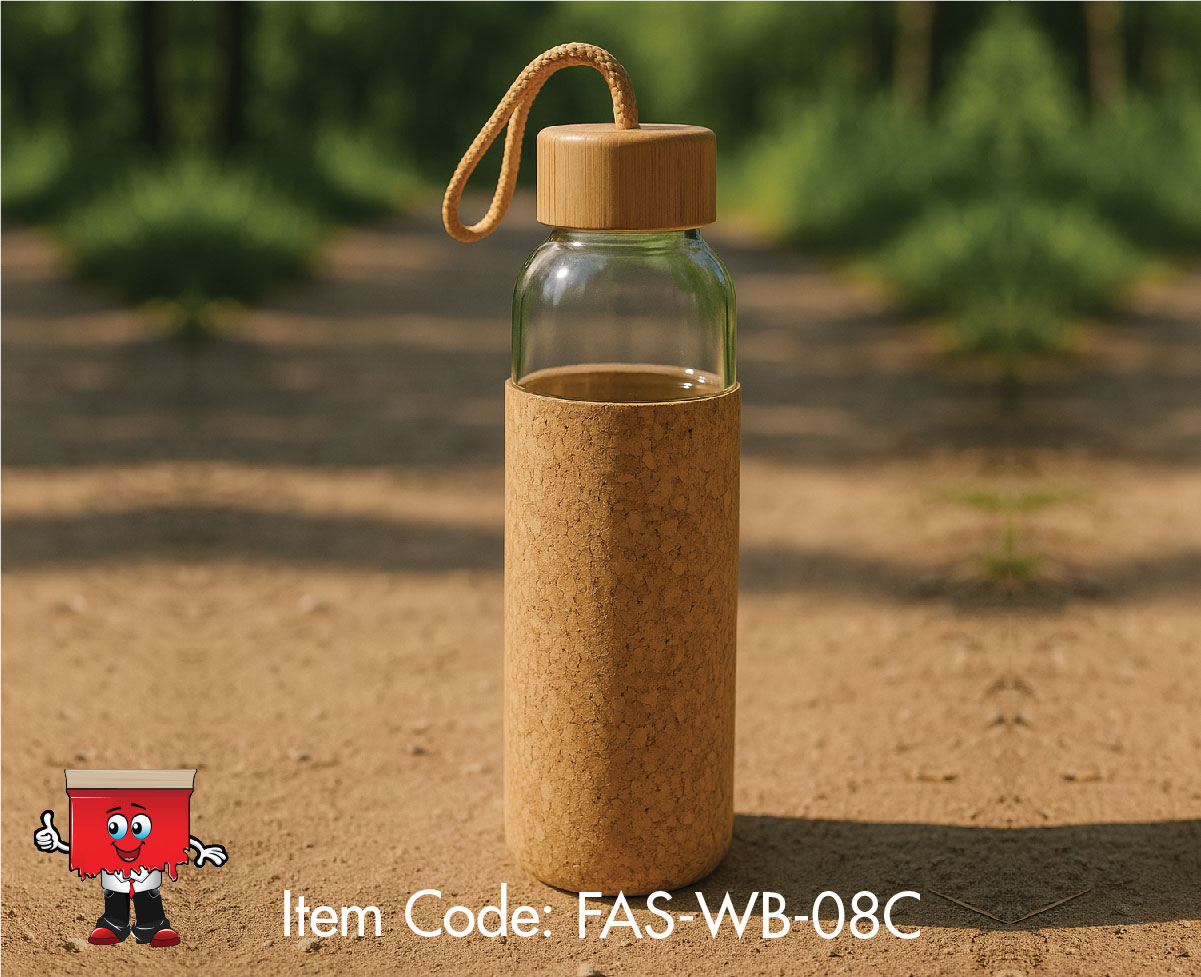 FAS-WB-08C : Borosilicate Glass Water Bottle with Cork Sleeve and Bamboo Lid with Natural gift box