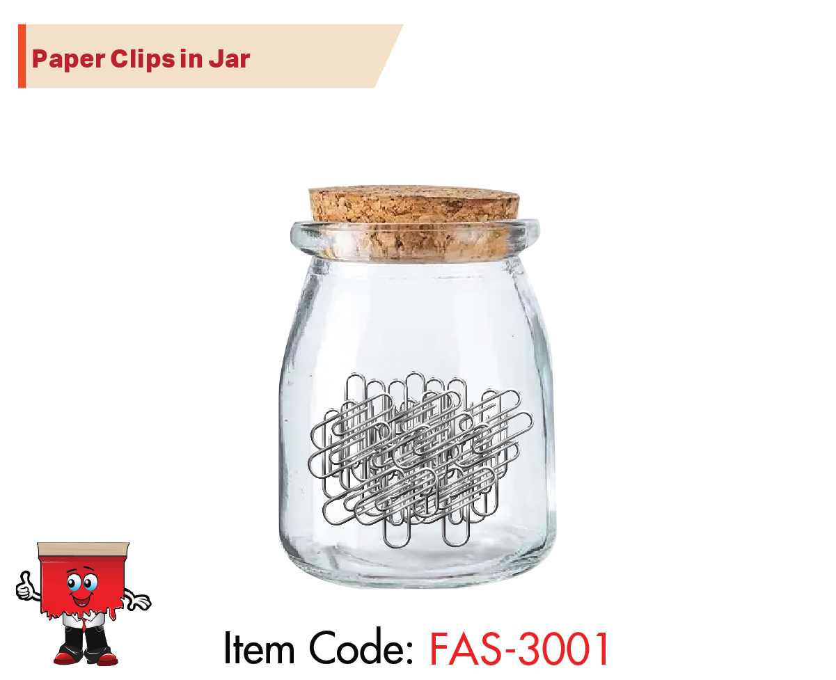 Paper Clips in Jar Color: Transparent Size: 5 x 8 cm Material: Glass & Cork Quantity: 100 PCS Carton Size: 45 X 45 X 36 cm Carton Weight: 13 KGS